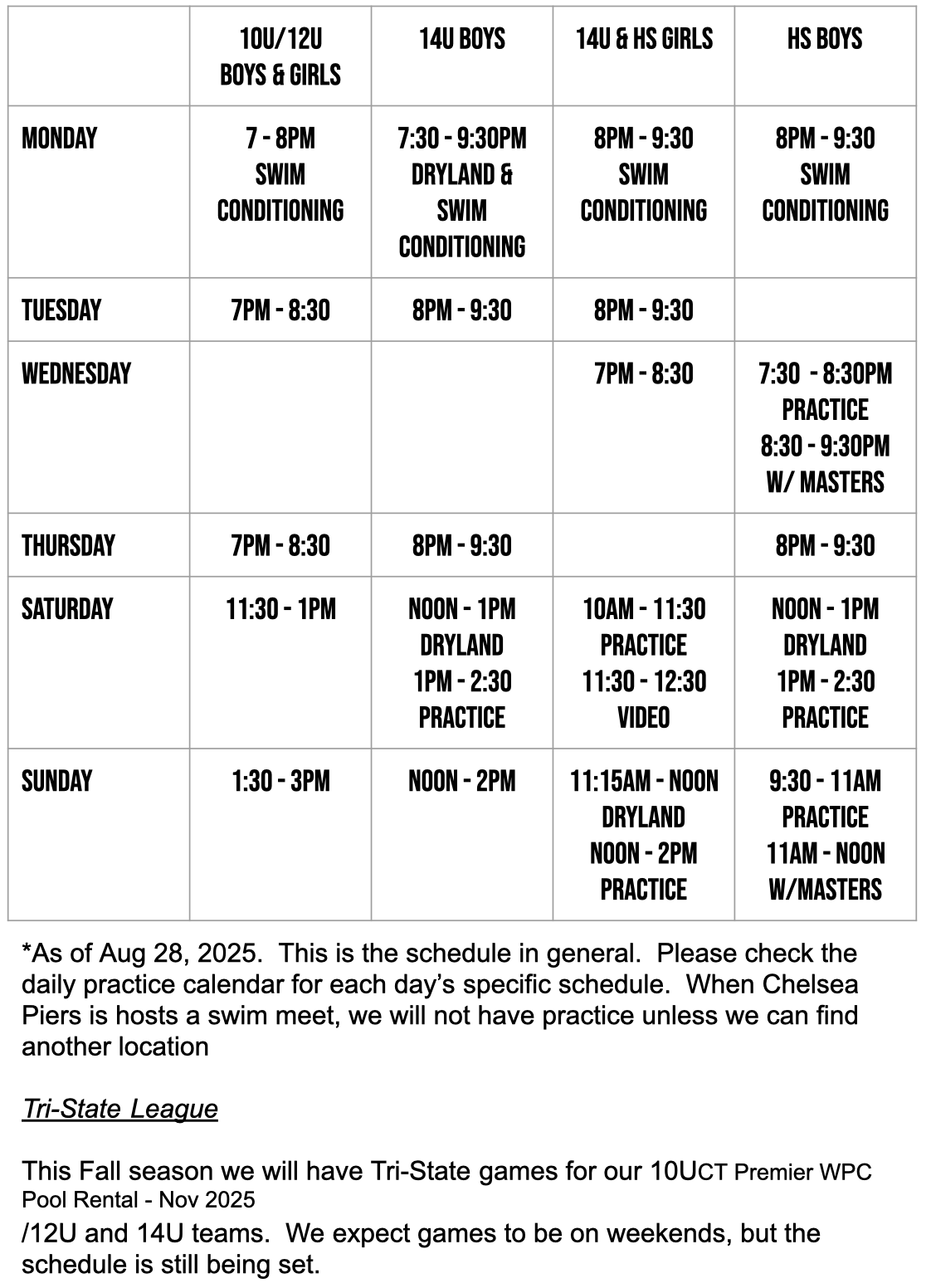 The 2025 Fall season will run September 6 - November 25. The tentative practice schedule is below, subject to change based on pool availability.