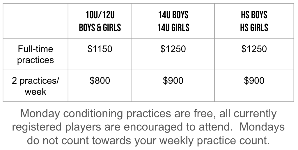 We offer practice packages that best fit your schedule, either 2x or 4x per week. All players are welcome to join the optional swim conditioning practice on Monday evenings.