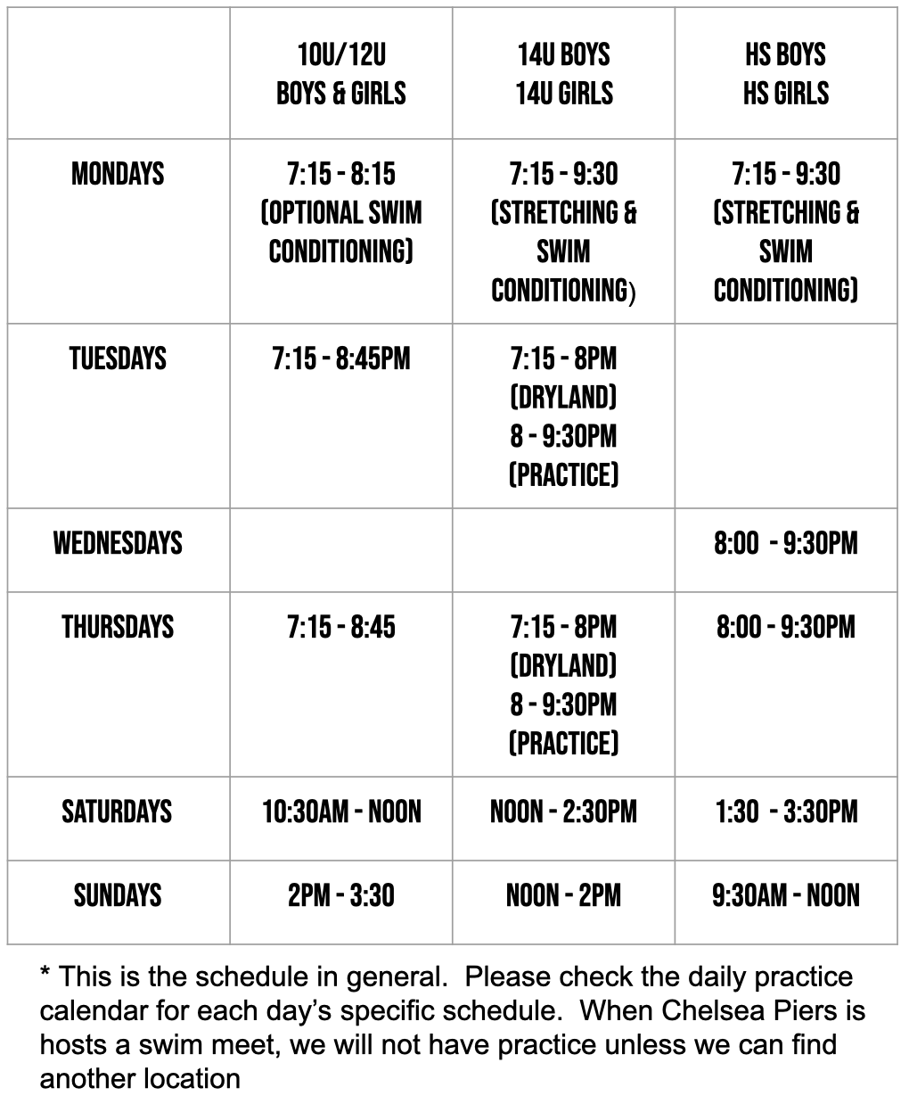 When Chelsea Piers hosts a swim meet, we do not have access to the pool. On these days, we will try to find alternate locations for practice, but if we cannot, practices will be cancelled for that day.
